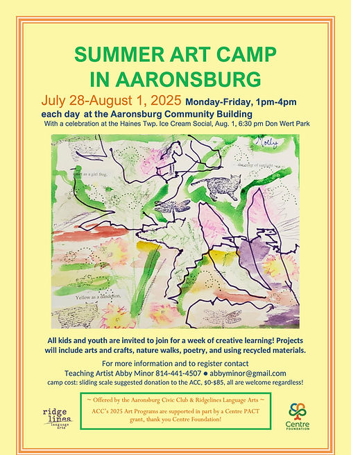 These poems were written over the past year and a half by participants in our Art & Imagination Club program in partnership with the Aaronsburg Civic Club. This weekly after-school program invites East Penns Valley youth to explore visual art, poetry, and nature, and the connections between the three. We hope you'll stop by and enjoy their words!